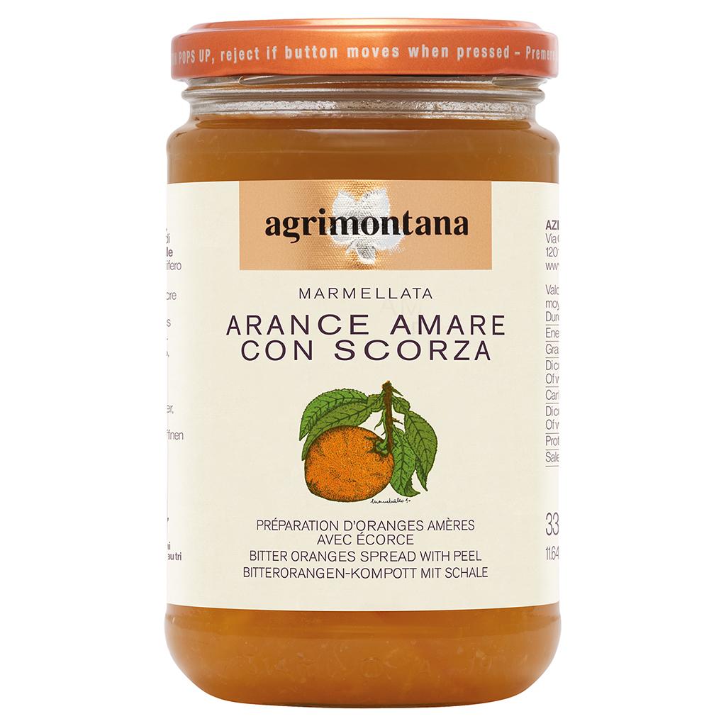 Marmellata di AranceAgrimontana Art-Nr: AGR252106 Verfügbarkeit: Inhalt: 330 g SpezifikationenProduktspezifische Attribute Allgemeine InformationenStk/Kar:12Produzent:AgrimontanaLand:ItalienRegion:PiemontInhalt:330 gNährwerttabelleEiweiss (g):0.5Energiegehalt (in kcal):174Energiegehalt (in kj):739Fett (g):0Fettsäuren gesättigt (g):0Kohlenhydrate (g):42Kohlenhydrate davon Zucker (g):41Nährwertangabe pro:100gSalz (g):0ZutatenZutaten:Orangen 70 %, Rohrzucker, Orangenschalenstreifen (2,7 %), Geliermittel: Pektin. Ingrédients:Oranges 70 %, sucre de canne, écorces d'orange en lamelles (2,7 %), gélifiant : pectine. Ingredienti:Arance 70%, zucchero di canna, scorza d'arancia a strisce (2,7%), gelificante: pectina. Zurück