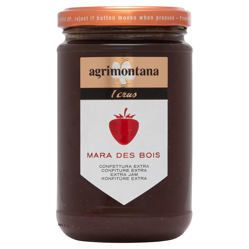 Fraises de la variété Mara de bois, sucre de canne, jus de citron, gélifiant : pectine ; jus de sureau concentré, antioxydant : acide ascorbique. Préparé avec 72 g de fruits pour 100 g.