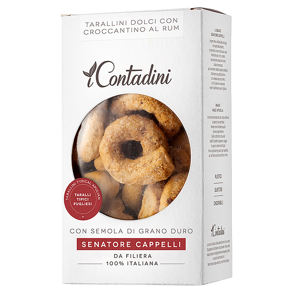 Ingredienti:semola di GRANO duro Senatore Cappelli 29,4%, farina di FRUMENTO, vino bianco (SOLFITI), olio di semi di girasole alto oleico, granella di croccante 16% (ARACHIDI, zucchero), zucchero 8,8%, pasta caramello al rum 3% (NOCCIOLE, zucchero, olio di girasole, aroma rum, emulsionante: lecitina di girasole, antiossidante: estratto di rosmarino), sale, agenti lievitanti: bicarbonato di sodio.