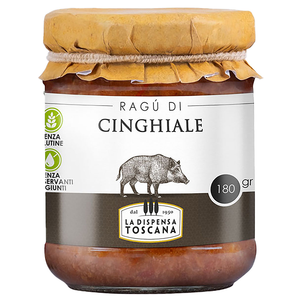 Carne di cinghiale 60%, polpa di pomodoro (pomodoro, correttore di acidità: acido citrico), cipolla, carne di suino, vino (contiene SOLFITI), olio extravergine di oliva, aglio, sale, olive (olive, acqua, sale, correttore di acidità E330 acido citrico), pepe, cacao amaro in polvere, salvia, rosmarino, peperoncino, timo.
